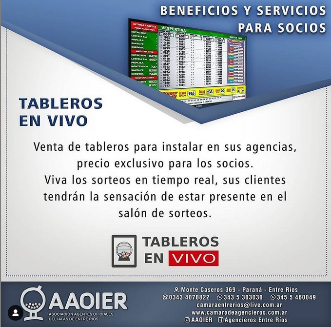 Por medio de la AAOIER podes adquirir la compra de los kits de Tableros en Vivo. Precio exclusivo para los socios. Comunícate a nuestros contactos para mayor información.
