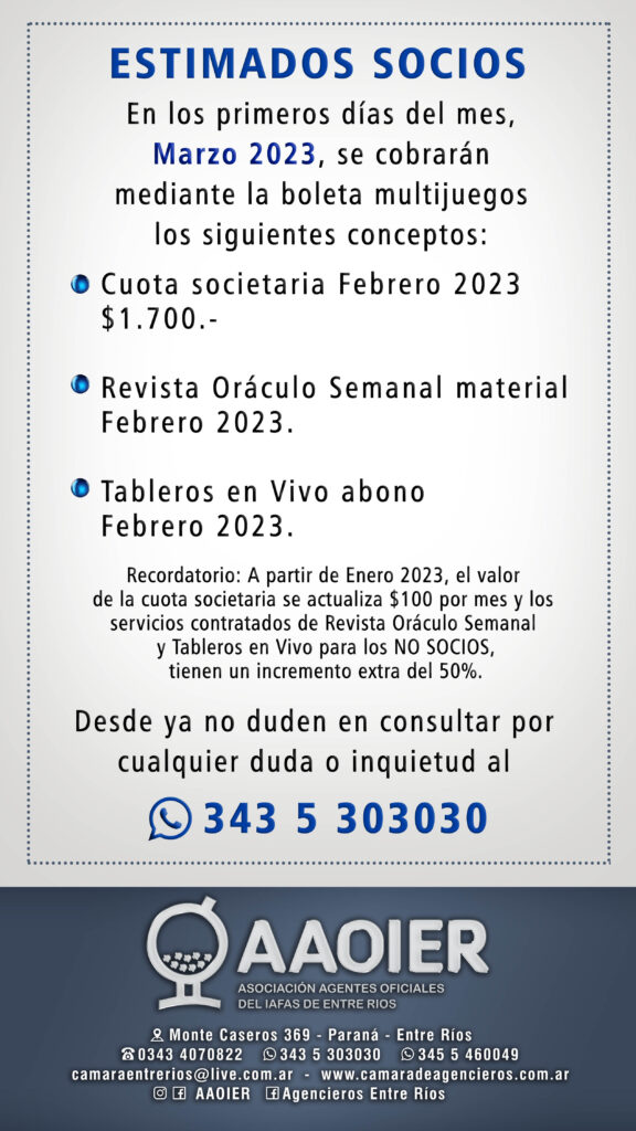 Tengan en cuenta que los clientes de la Revista Oráculo Semanal y de Tableros en Vivo, que NO sean SOCIOS de la AAOIER, tienen un incremento extra.