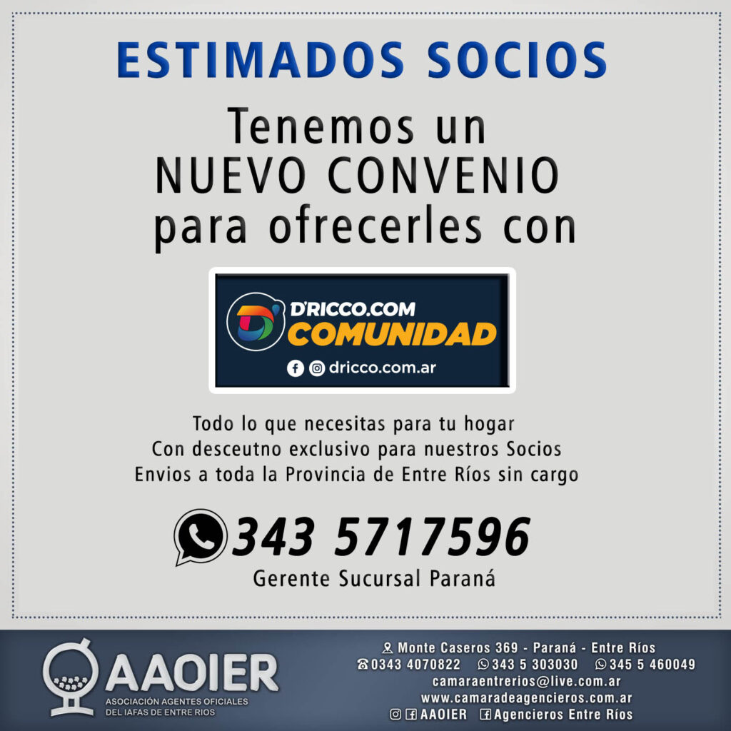 Estimados Socios, tenemos un nuevo convenio para ofrecerles con la casa de Electrodomésticos DRicco ubicada en el nuevo Shopping Paso del Paraná. Con descuentos exclusivos para Uds. y para los Socios que son del interior pueden coordinar sus compras con Rodrigo (Gerente Sucursal Paraná) y todo lo que necesiten se les envía SIN CARGO a su domicilio.