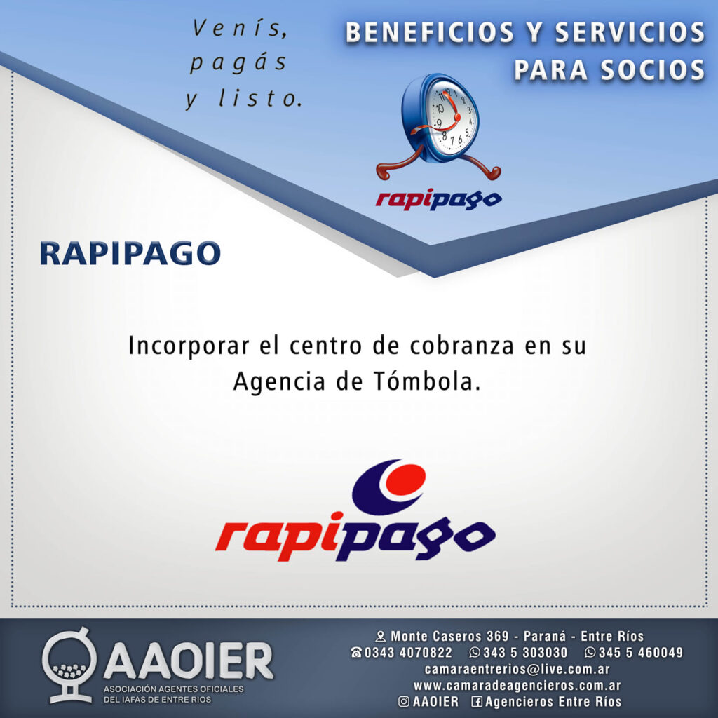 Siendo socio de la AAOIER podes sumarte al convenio que tenemos con RAPIAGO. Si te interesa conocer más información comunicate al 343 5303030.
